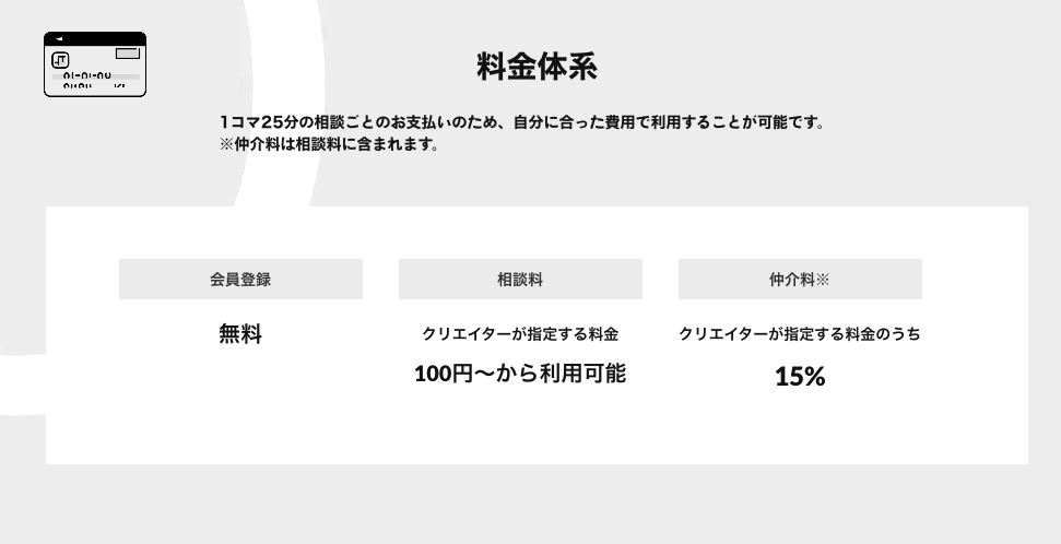 | 相談料 | クリエイターが指定する料金 100円〜から利用可能 |