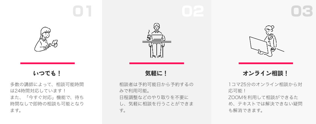 ZOOMを利用して相談ができるため、テキストでは解決できない疑問や抽象的な問題を解消できます。
