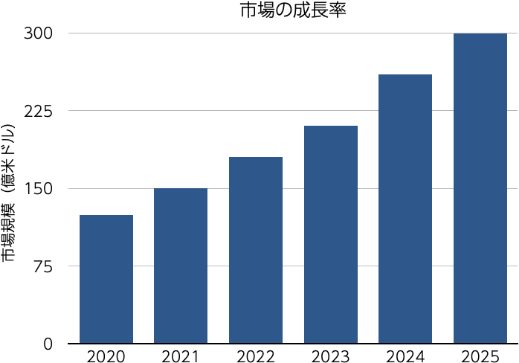コンピューターの計算能力の向上を背景に、ハイパースペクトル市場は年々拡大を続けており、2020年の124億米ドルから2025年には300億ドルと年率19.3%の成長が期待されております。
