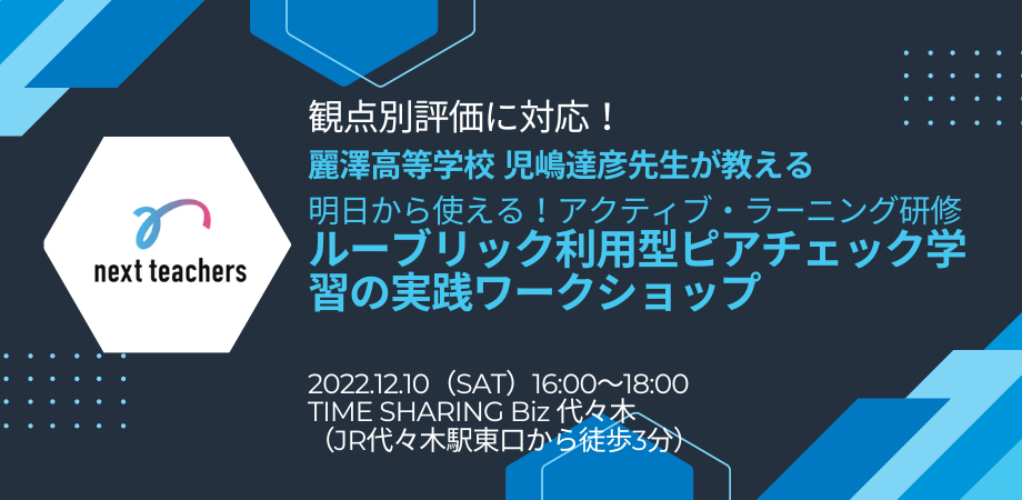 教員の授業研修やICT活用研修、SNS広報研修を支援している株式会社NextTeachers(所在:東京都北区、代表取締役社長:渡辺 健太、以下NextTeachers)ではこのたび、私立および公立学校の教員の方々を対象とし、新学習指導要領に合ったアクティブラーニングとルーブリック活用の研修会を2022年12月10日(土)に代々木にて開催します。