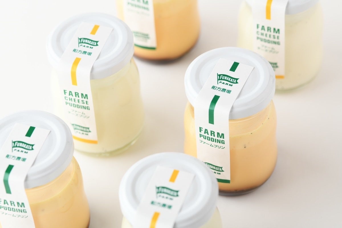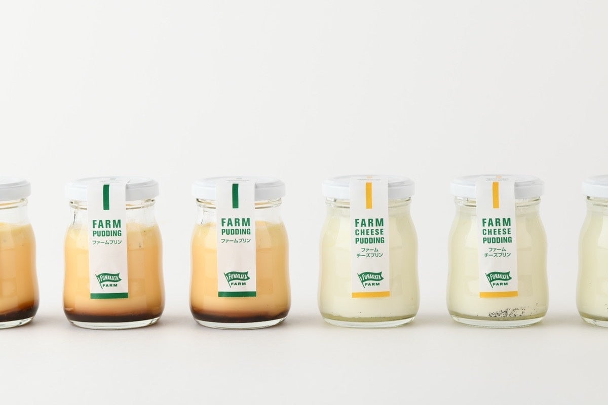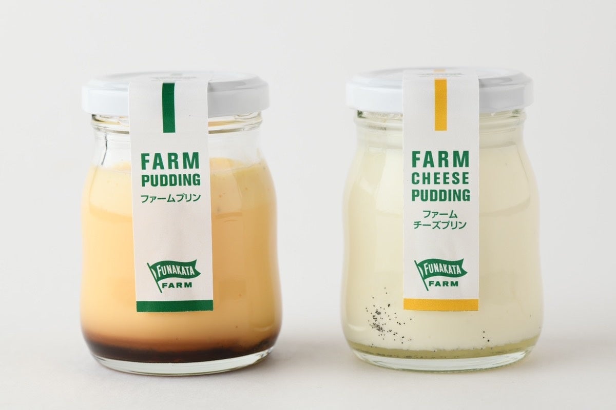 「船方農場ファームチーズプリン」は、船方農場のクリームチーズを使った、真っ白な見た目の繊細なプリン。「船方農場ファームプリン(かため)」はファームプリンの味わいをそのままに、しっかりとした固さのあるプリンです。