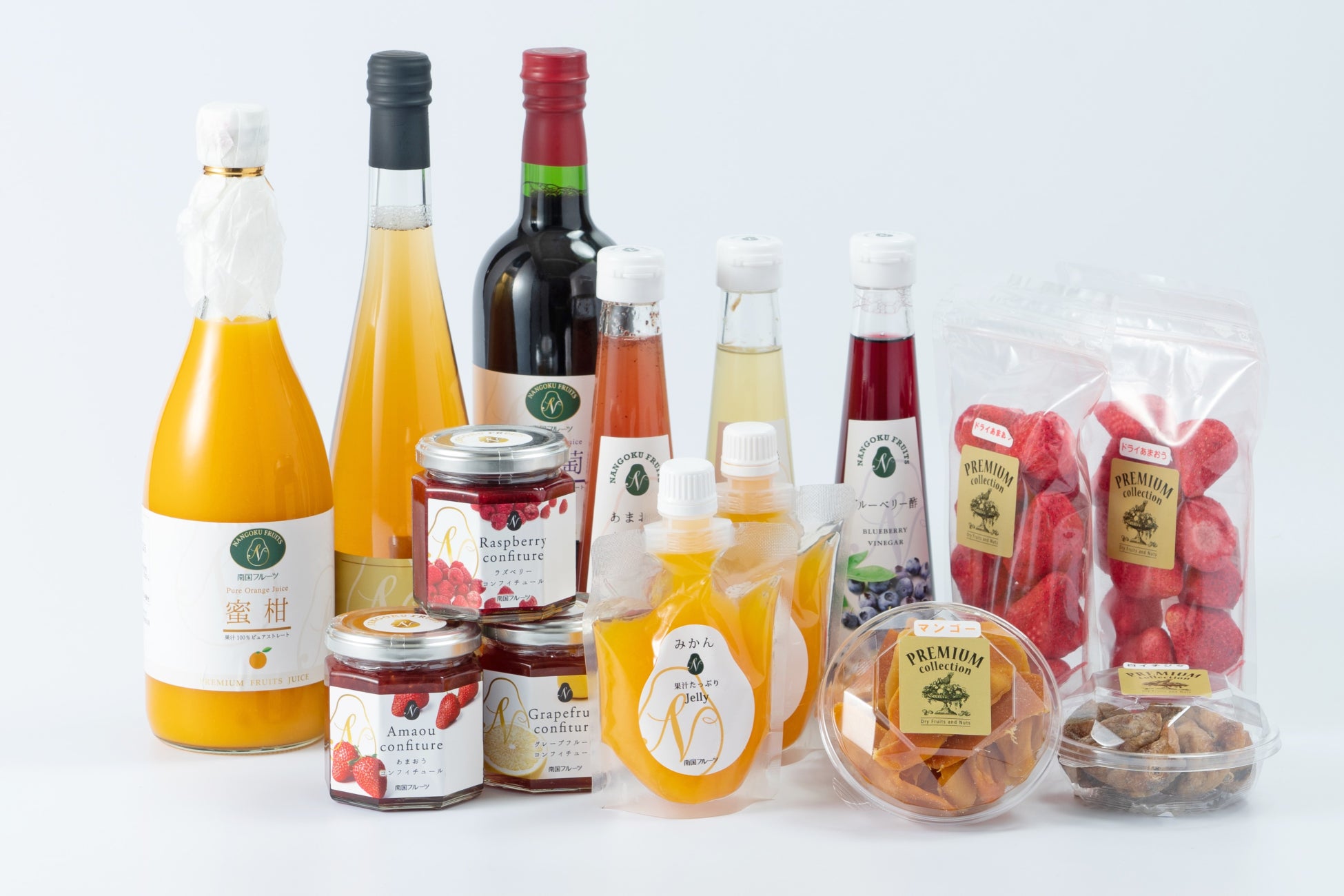 添加物不使用・果汁100%のピュアストレートジュースや、フルーツゼリー、果物菓子などもございます。