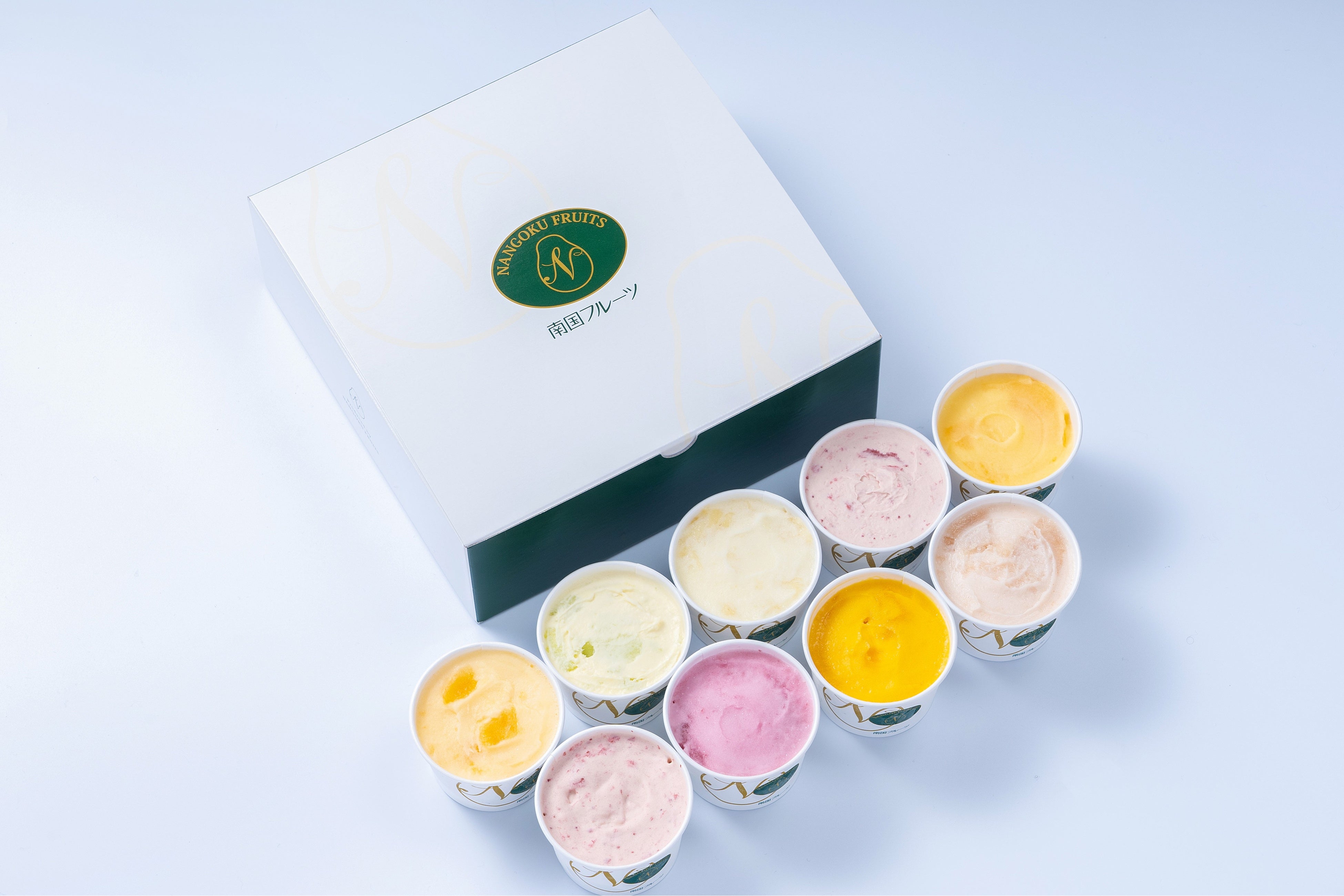 試作を重ね、リニューアルした自社製のジェラート。フルーツ専門店らしく、果肉を感じ果物のおいしさを存分に引き出すことにこだわりました。フレーバーは8種類です。(福岡産あまおう・佐賀産もも・長崎産不知火・大分産ぶどう・宮崎産マンゴー・熊本産メロン・鹿児島産タンカン・沖縄産パイナップル)九州各県を代表する特産フルーツの旬の味わいを堪能することができます。