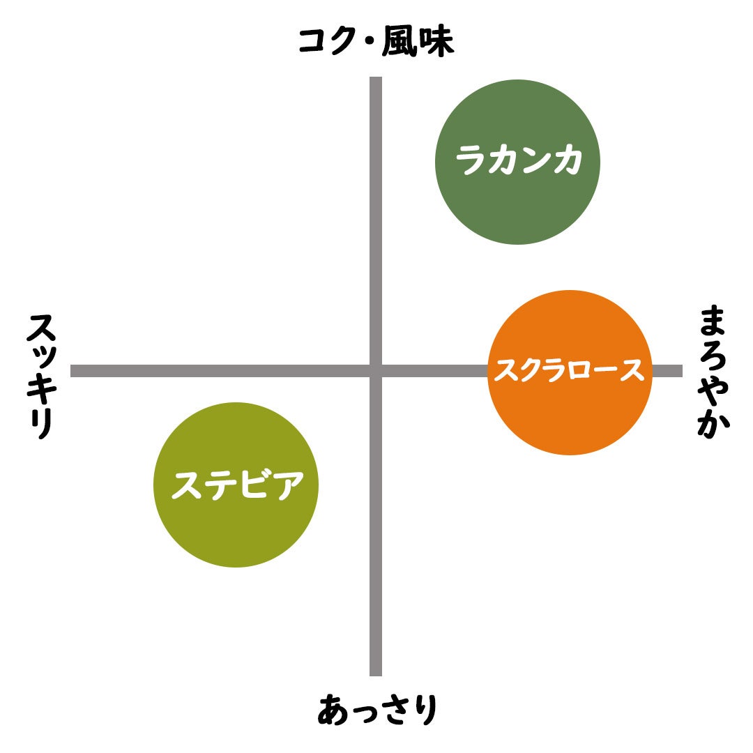 黒糖風味のコクのある甘さが特長の「ラカンカ」に、あっさりとした甘さと独特の苦みで料理の旨味を引き出す「ステビア」、砂糖由来のしっかりとした甘味を楽しめる「スクラロース」。