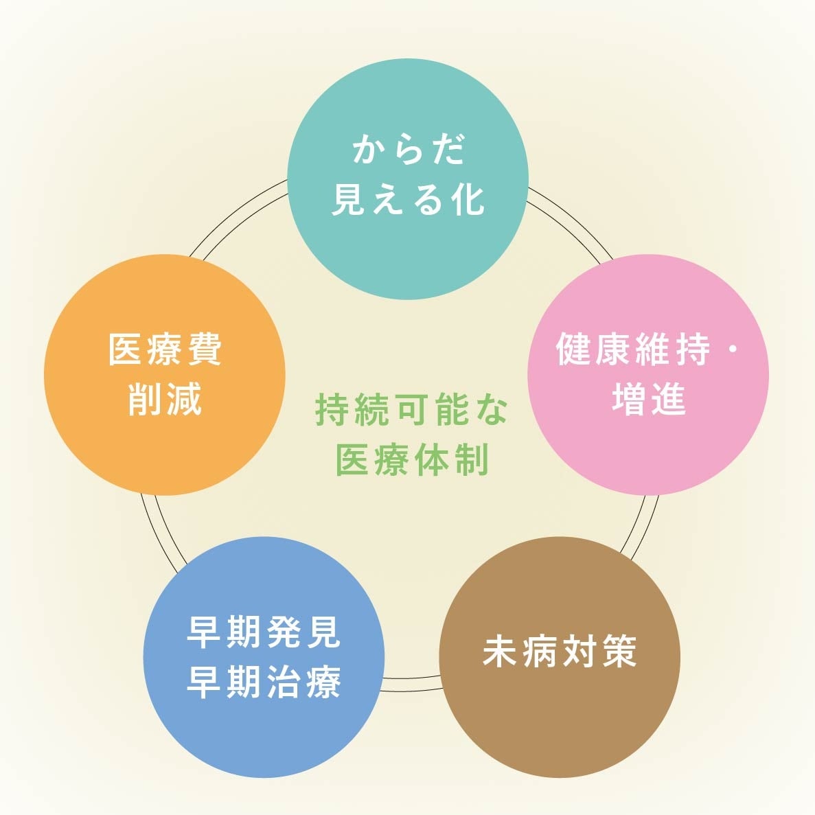 当社の活動を通じて、誰でも、手軽に、継続して、健康で生活できる社会の実現、ひいては社会の医療費適正化と持続可能な医療体制に貢献できることを目指します。