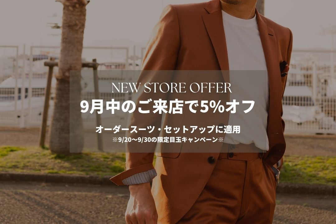 9/20〜9/30までにご来店のお客様はオーダースーツ・セットアップ5%オフにてご購入いただけます。