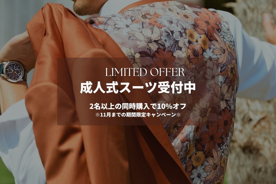 9/20〜11/10の期間中、成人式スーツをお求めのお客様に限り、2名以上(またはお1人様2着以上)のご購入でオーダースーツ・セットアップを10%オフにてご購入いただけます。