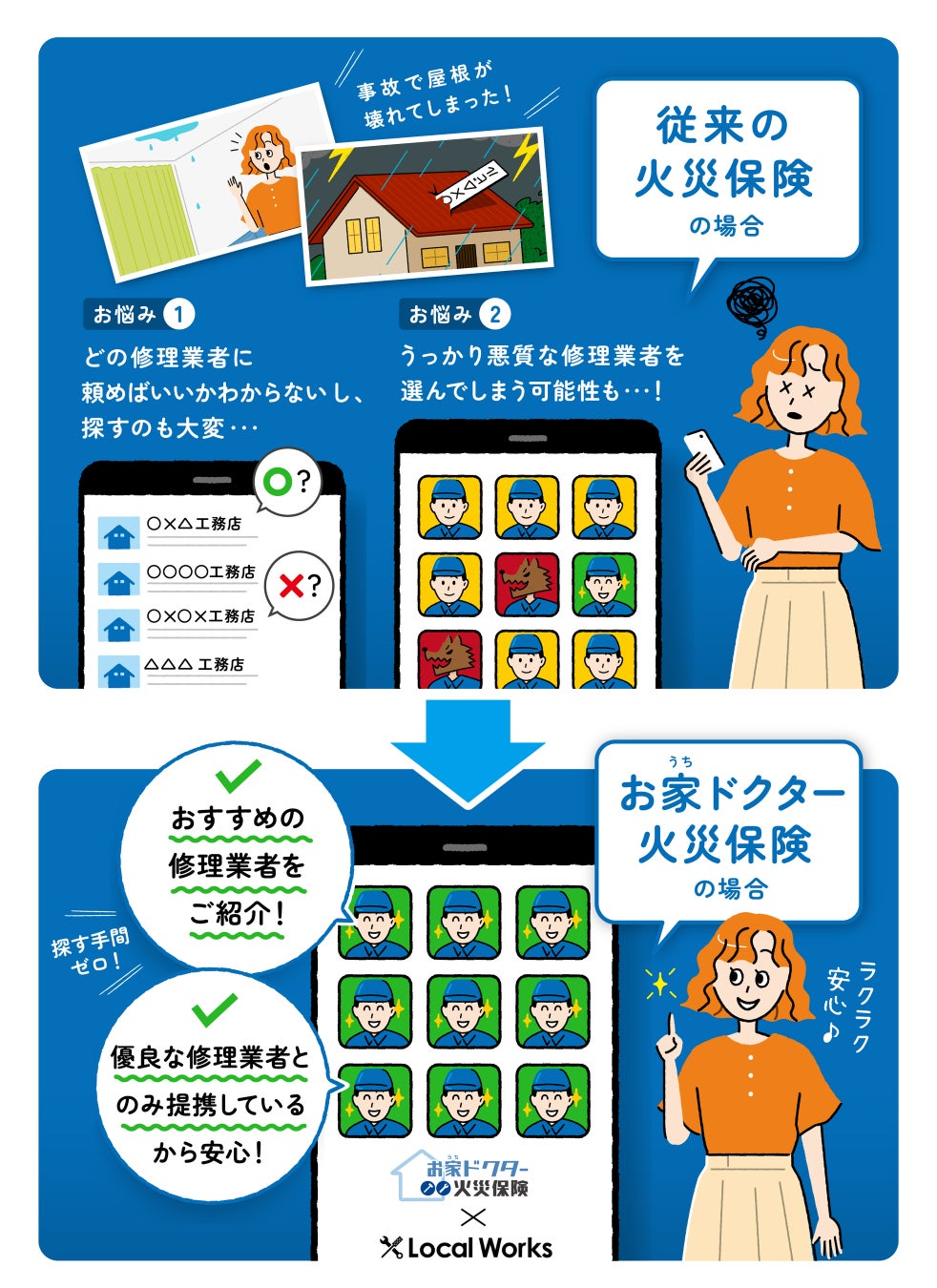 全国に約5,000社の修理業者のネットワークを擁するローカルワークス社が、本商品のために優良な修理業者(指定工務店)を評価・選抜し、事故の際に住まいの修理を担う仕組みを新たに導入しました(業界初)。お客さまにとって手間なく高い品質の修理が可能となります。