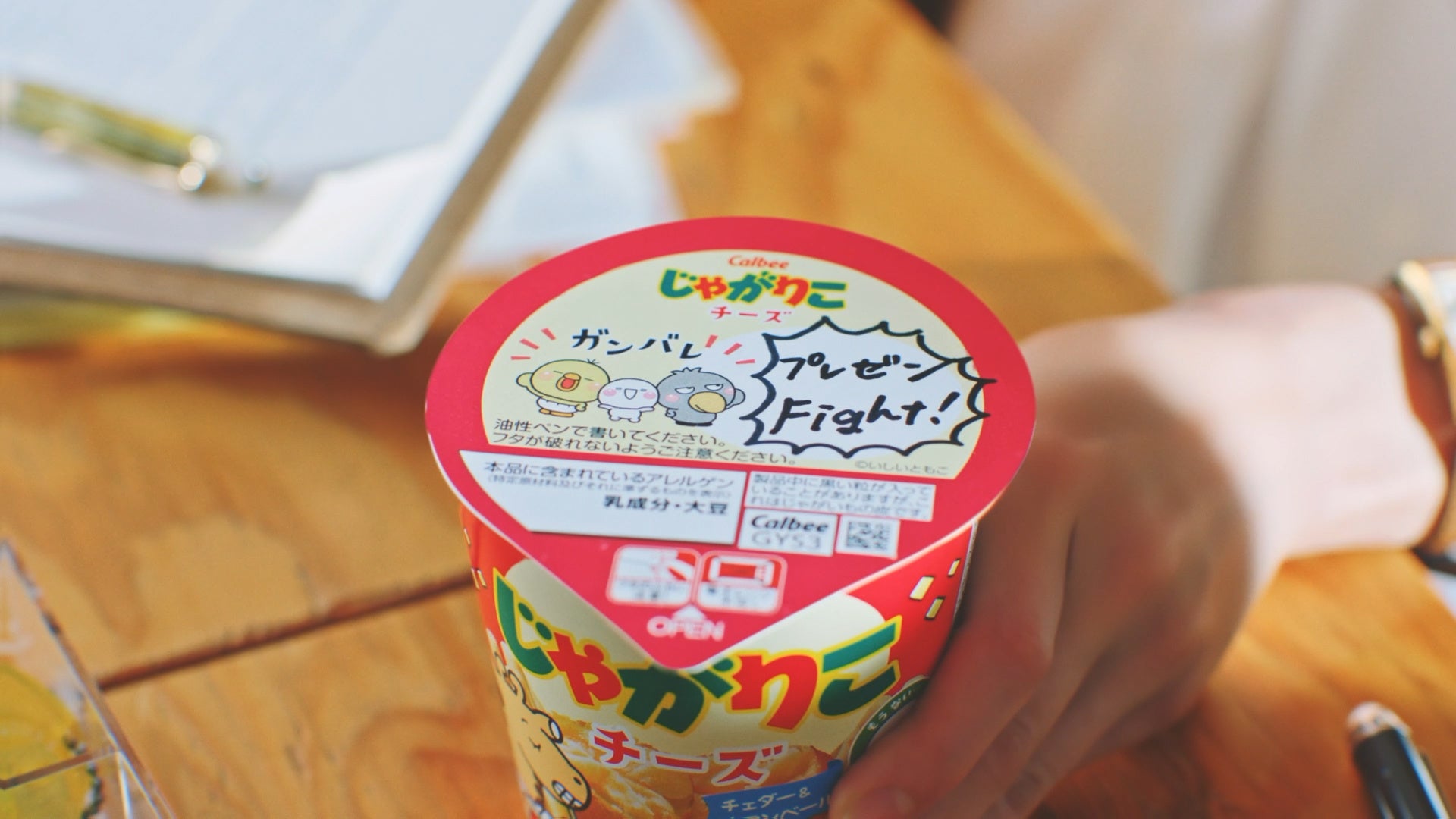 この間朝ドラの現場に「あげりこ」をして、蓋のメッセージを書ける部分に「今日も頑張りましょう」とか「いつもありがとうございます」とか色んなメッセージを添えて、みなさんにプレゼントできました。メッセージを書いて、この「じゃがりこ」をあげられたことは嬉しかったです。