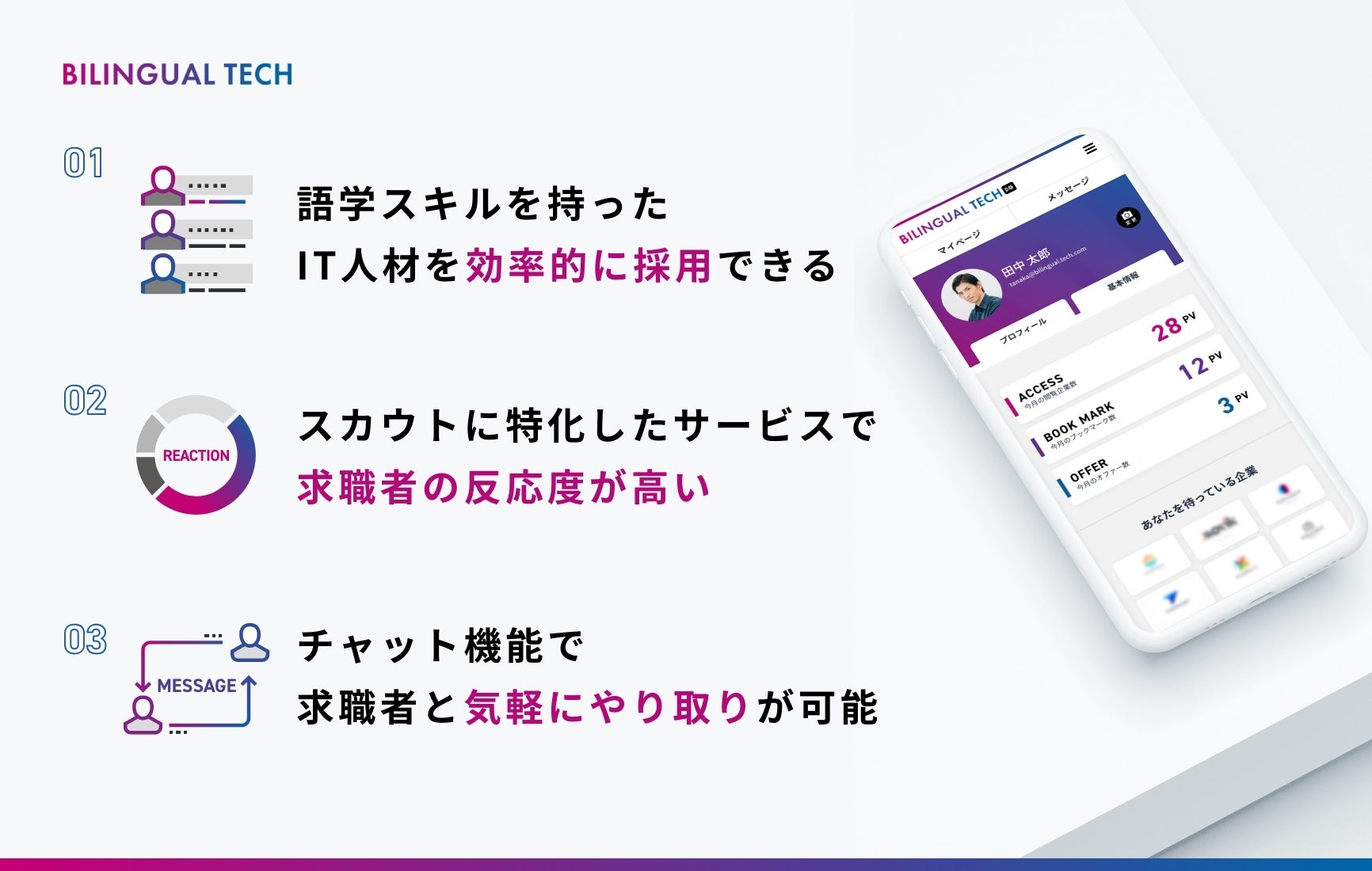 BILINGUAL TECH は一般的な広告掲載型の転職サイトとは違い、企業からの個別スカウトに特化したサービスです。そのため、興味度の低い求職者からの無駄な応募は無く、ターゲット人材のみと密なコンタクトが可能です。同時に採用業務の効率化にも繋がります。