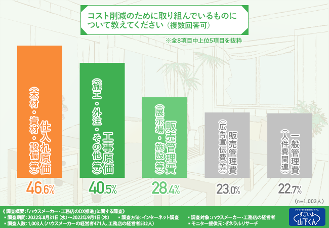 ウッドショックや資材の高騰により販売管理費の削減よりも仕入れ原価・工事原価の削減に取り組まれている方が多くいらっしゃる結果となりました。