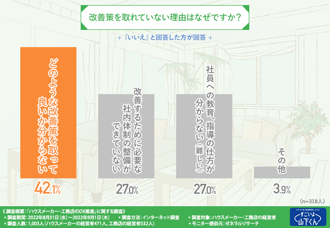 先程の質問で『いいえ』と回答した方に、「改善策を取れていない理由はなぜですか?」と質問したところ、『どのような改善策を取って良いか分からない(42.1%)』『改善するために必要な社内体制の整備ができていない(27.0%)』『社員への教育、指導の仕方が分からない(難しい)(27.0%)』と続きました。