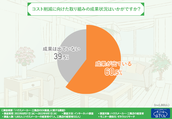 そこで、「コスト削減に向けた取り組みの成果状況はいかがですか?」と質問したところ、『成果が出ている(60.5%)』『成果は出ていない(39.5%)』という回答結果になりました。