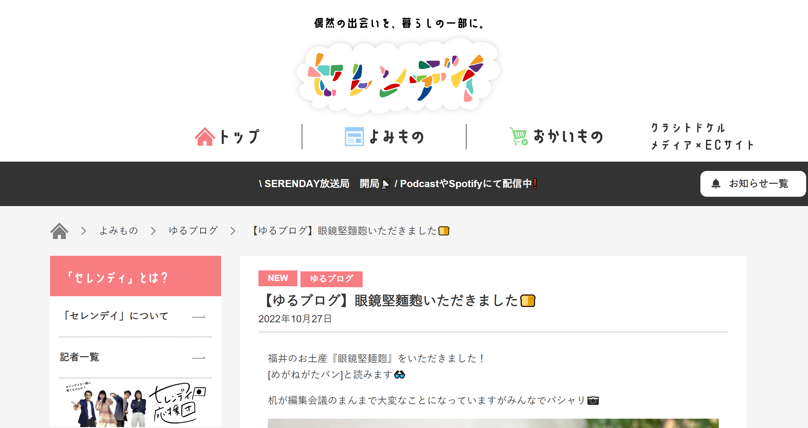 大学生が運営・企画・記事制作まで全てを担うメディア×ECサイトです。『セレンデイ』とは、「偶然の産物」「幸運な偶然を手に入れる力」を意味する言葉“セレンディピティ”と“DAY”を掛け合わせた造語です。そうしたセレンディピティな出会いを求める学生に「よみもの」「おかいもの」を通して暮らしがちょっと楽しくなる出会いを提供したいと思っております。