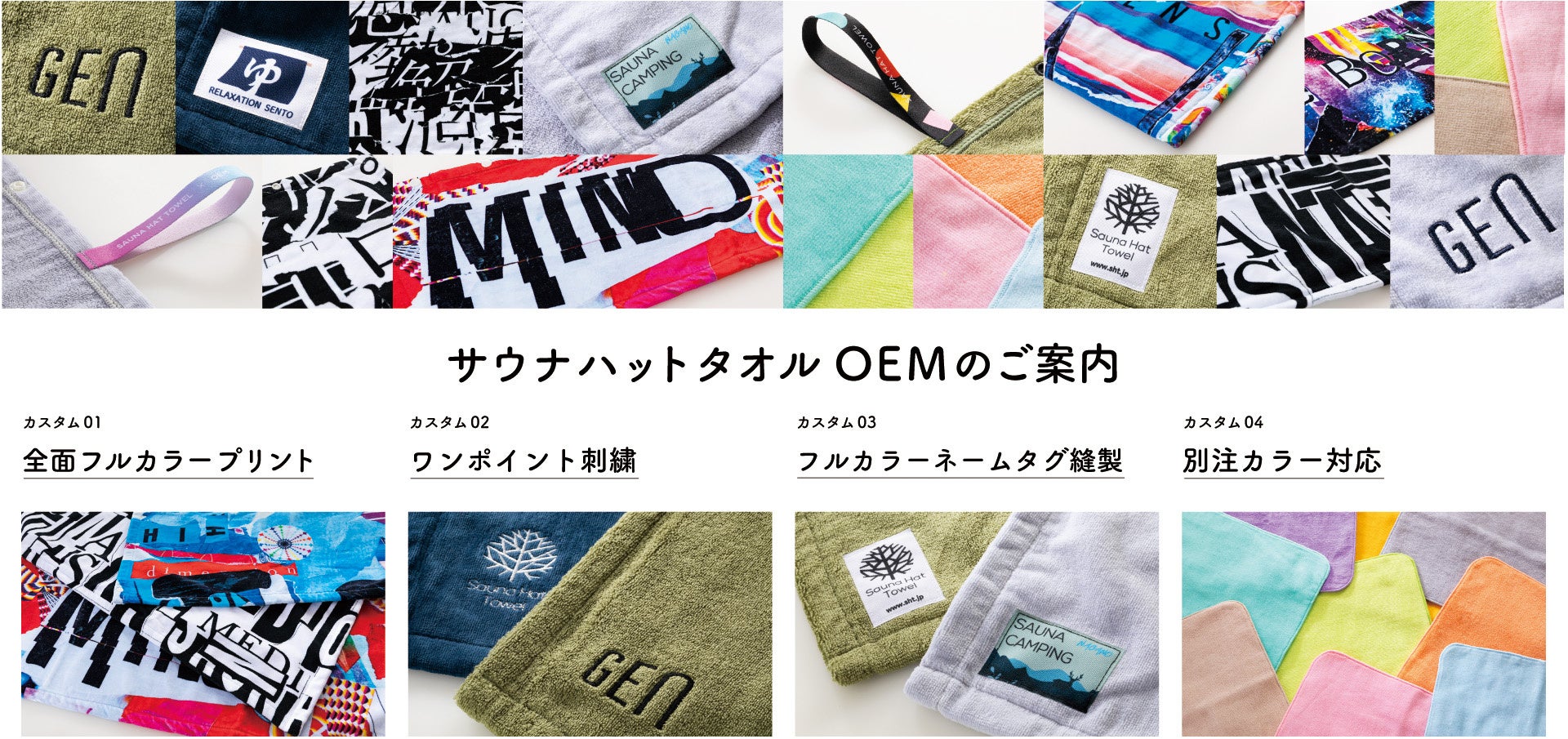 全面フルカラープリント、ワンポイント刺繍、プリントネームタグ縫製などのOEM製造も少ロットでの相談が可能。オリジナルのサウナハットタオルを作りたいファッションブランドや、温浴施設からのお問い合わせもお待ちしております。