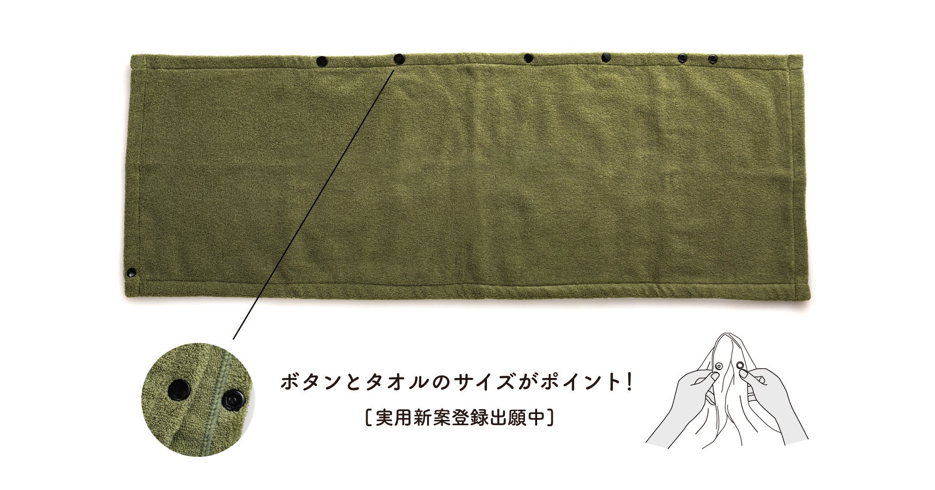 源商店が開発した「サウナハットタオル」は、入浴時の必需品であるタオルに「カバーする」という概念を取り込み、快適なサウナ体験を追求して作られました。サウナシーンや体の拭きやすさ等を考慮して設計されたサイズ(約W880×H300mm)のタオルに設置されたのは、熱くなりすぎない素材を使用した7つのボタン。ボタンの留め方ひとつで、頭や髪を熱から守るサウナハットのように使えるだけでなく、サウナ室での息苦しさを大幅に低減するサウナマスクとしても機能します。サウナで「ととのう」には、一定時間入って身体を温める必要があるものの、熱波による息苦しさから、身体が温まる前に断念してしまう方がいるのも事実。サウナハットタオルなら、ボタンの留め方次第でロウリュやアウフグースといった熱波の強いサウナでも息苦しさを回避し、存分にサウナを楽しめます。