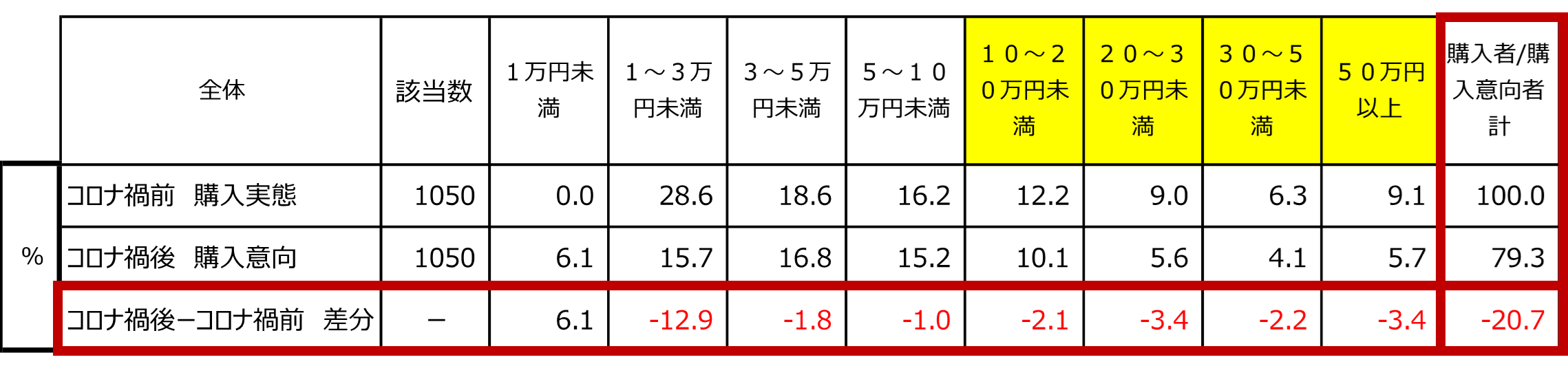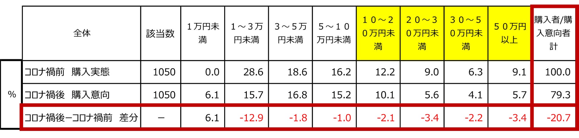 ■コロナ禍前とコロナ禍後の購入実態に関して(n=1050)※コロナ禍以前に購入したジュエリー購入額別