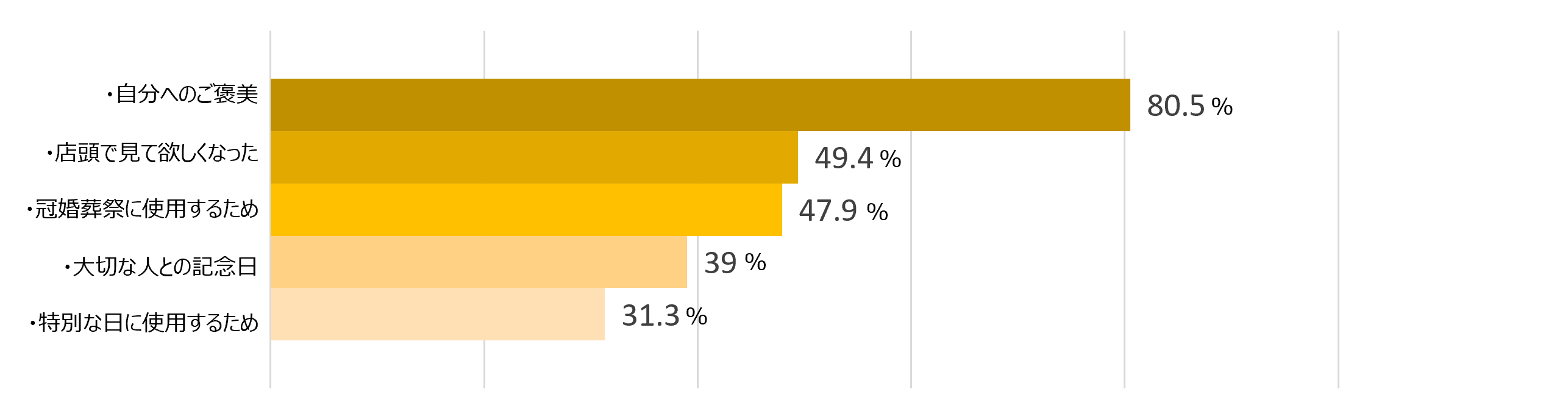 - ジュエリーを購入する際、約80%が「自分へのご褒美買い」と回答!「大切な人との記念」で購入する人も多く、ジュエリーにはそれぞれの思い出が詰まっていることが判明。