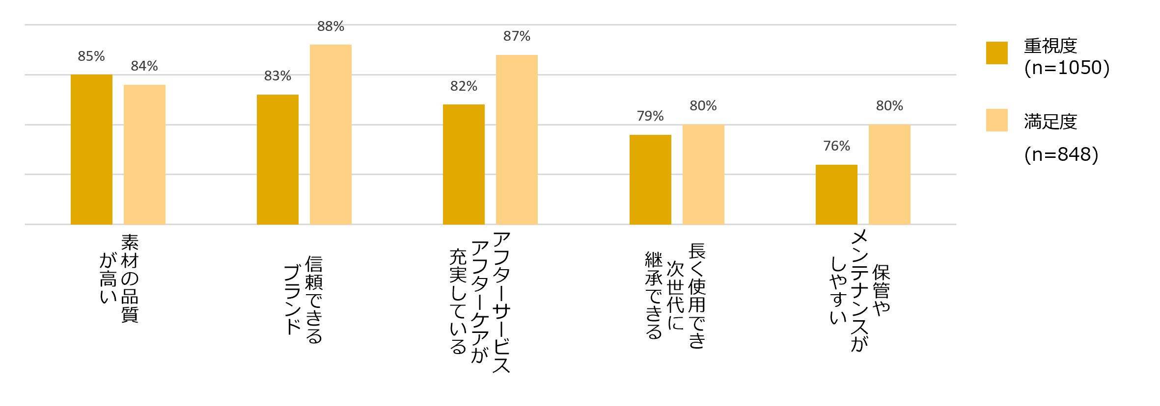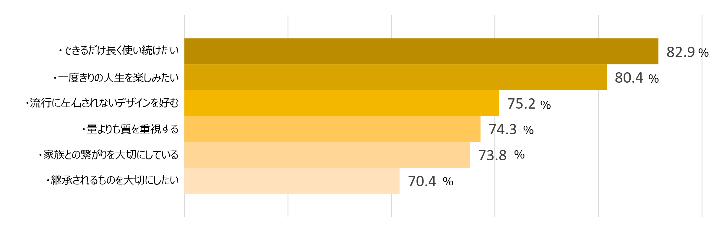 - 物事に対する価値観では「できるだけ長く使用したい」が1位にランクイン。「流行に左右されない」「家族との絆を大切にしたい」「代々継承するものを大切にしたい」も上位の結果となり“次世代に継承し、受け入れられるもの”が求められていると判明