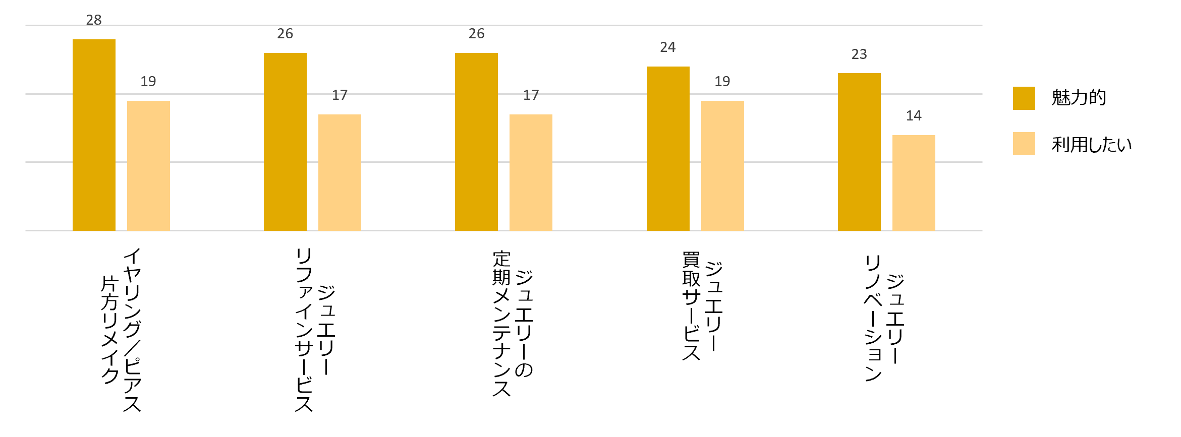 - 魅力的かつ、今後利用したいジュエリーサービス1位は「イヤリング/ピアス 片方リメイク」「ジュエリーリノベーション」も約14%と、新たに生まれ変わる“リメイク”の需要が増加。