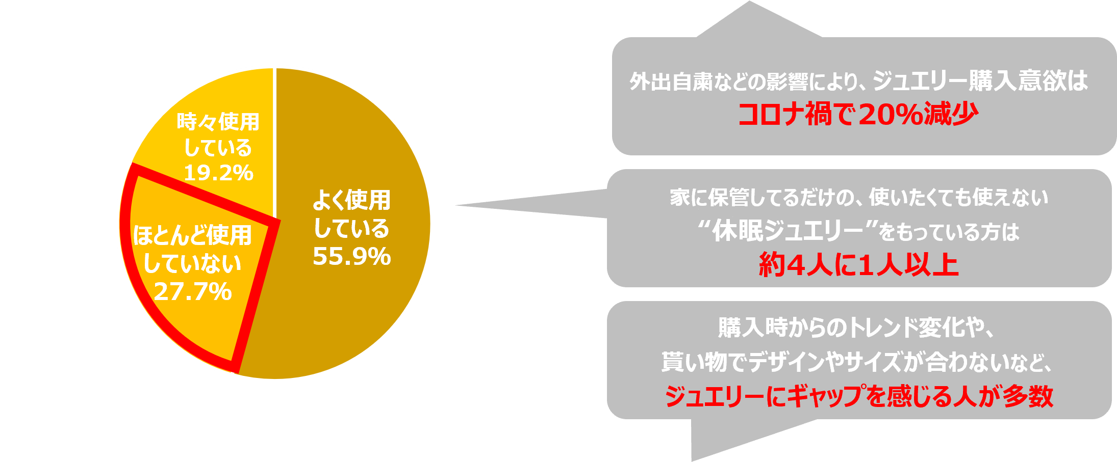 - コロナ禍でジュエリー購入意向は20%減少!4人に1人が「デザインが好みではない、サイズが合わない」などの理由で、家に保管してるだけの、使いたくても使えない“休眠ジュエリー”を保有していると判明!