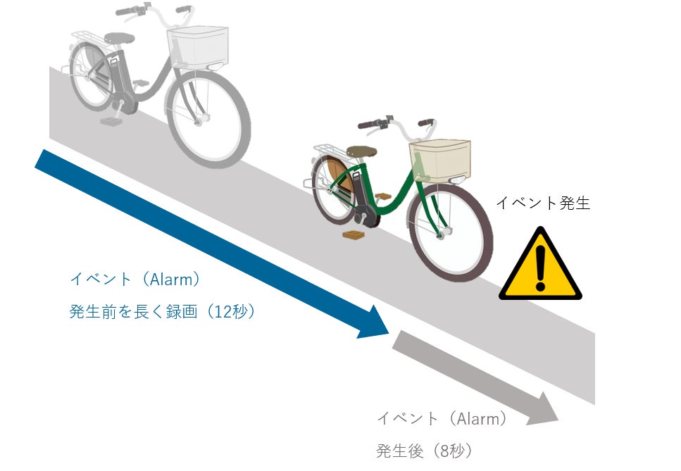 本製品は、電動アシスト自転車の利用環境にも適した機能を有し、「もしも」の際も、加速度センサーによって感知したイベント発生を瞬時に管理者へ通知、LTE回線を通じて映像をアップロード、専用アプリでの映像確認を実現し、電動アシスト自転車利用の更なる「安心・安全」を確立します。