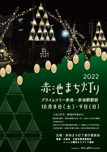 赤池まち灯り実行委員会(所在:愛知県日進市赤池町)は、10月8日(土)・9日(日)の二日間、大型ショッピングモール「PRIMETREE AKAIKE」(以下プライムツリー赤池)ならびに名古屋市営地下鉄「赤池駅」駅前広場を会場に「赤池まち灯り2022」を開催いたします。