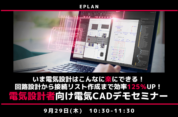 この度、EPLAN Software & Services株式会社(代表取締役 井形 哲三、以下EPLAN、神奈川県横浜市)は、9月29日(木)10:30-11:30に「いま電気設計はこんなに楽にできる!回路設計から接続リスト作成まで効率125%UP!電気設計者向け電気CADデモセミナー」を開催いたします。