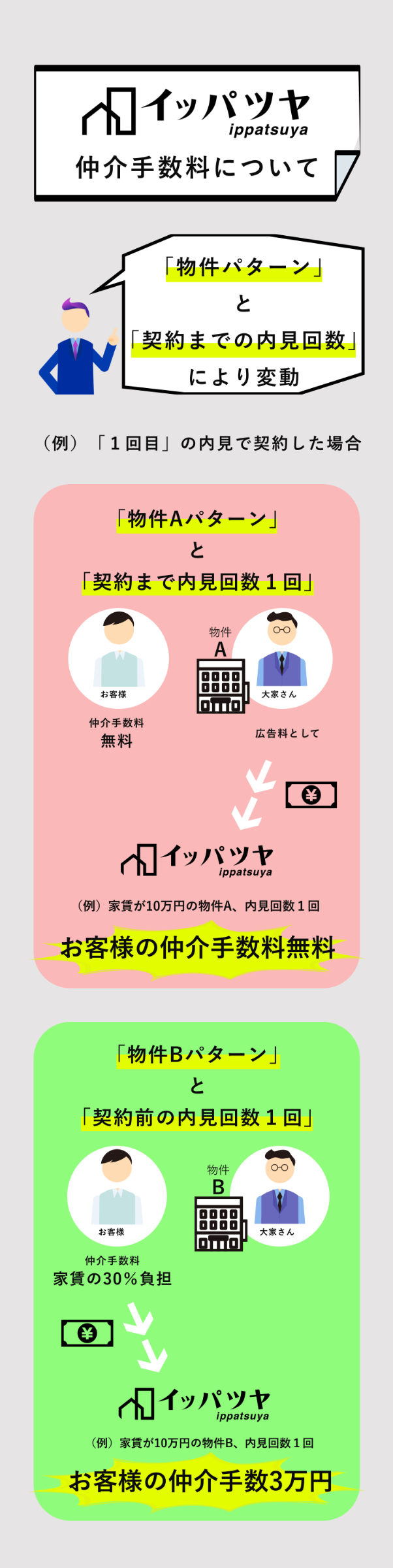 仲介会社としては「できるだけ内見回数は少なく部屋を決めてほしい」と考えます。ですので、イッパツヤでは内見回数が少なければ少ないほど仲介手数料が安くなる仕組みを導入しました。