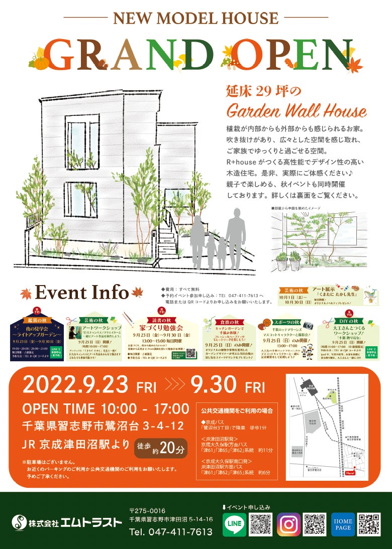 株式会社エムトラスト(本社:千葉県習志野市津田沼5-14-16/代表取締役:高橋勘太)は、2022年9月23日(金・祝)より、千葉県習志野市において「Garden Fall House」のモデルハウスをオープン致しますのでお知らせ致します。