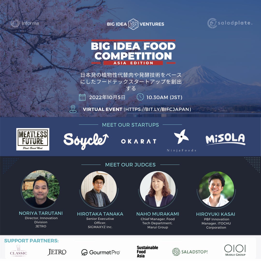 ビッグ・アイディア・ベンチャーズ(本社:米国NY、ディレクター:Andrew D Ive、以下BIV社)は、2022年10月5日にオンラインで日本版のBig Idea Food Competition Japan(以下BIFC Japan)を、 Gourmetpro株式会社(本社:東京北区、代表取締役:バタヤル ウゴ、以下 GourmetPro)とSustainable Foods Asia株式会社(本社:東京渋谷区、代表取締役:海野 慧)と共同で主催します。