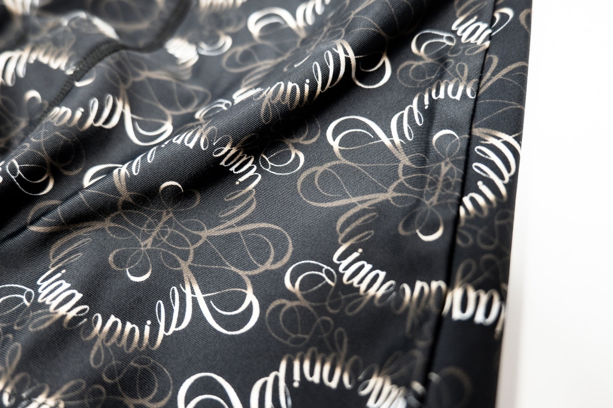 また、ブランド名をあしらったオリジナルパターンのプリント柄は、独特のメタリック感を表現した陰影のある仕上がり。素材特性上、精緻な図柄再現が難しいとされているナイロン生地へのプリント加工を可能にした数少ない生産背景による希少な生地を使用しています。