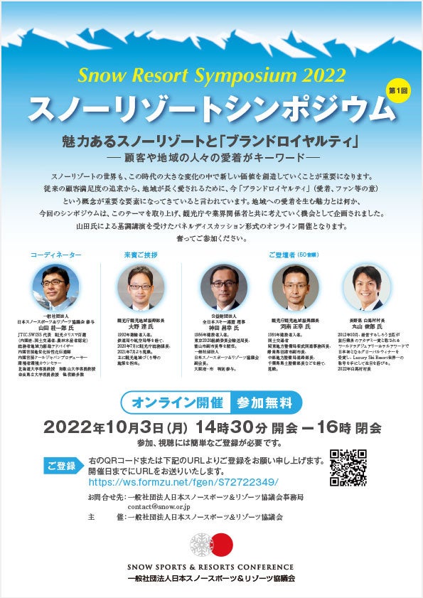 一般社団法人日本スノースポーツ&リゾーツ協議会は、2022年10月3日(月)にオンラインにて「Snow Resort Symposium 2022」を開催いたします。オンライン開催で参加費無料、当日の参加も可能です。