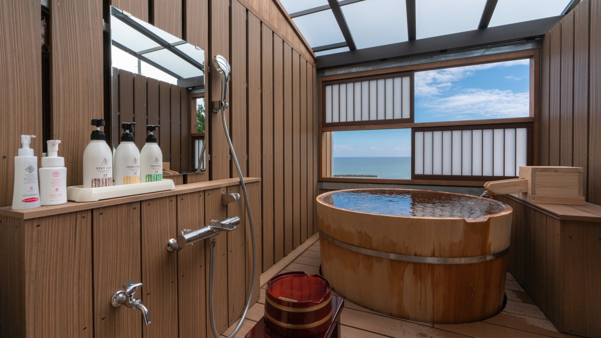 全室河津浜一望の温泉かけ流し露天風呂と、湯上りテラスを完備しております。そして、玉翠の創業からの伝統である、「湯守り」の技術を駆使し、温度管理をしております。また、温泉との相性を追求した自社開発のインバスアメニティ「ゆもりびと」を完備しております。