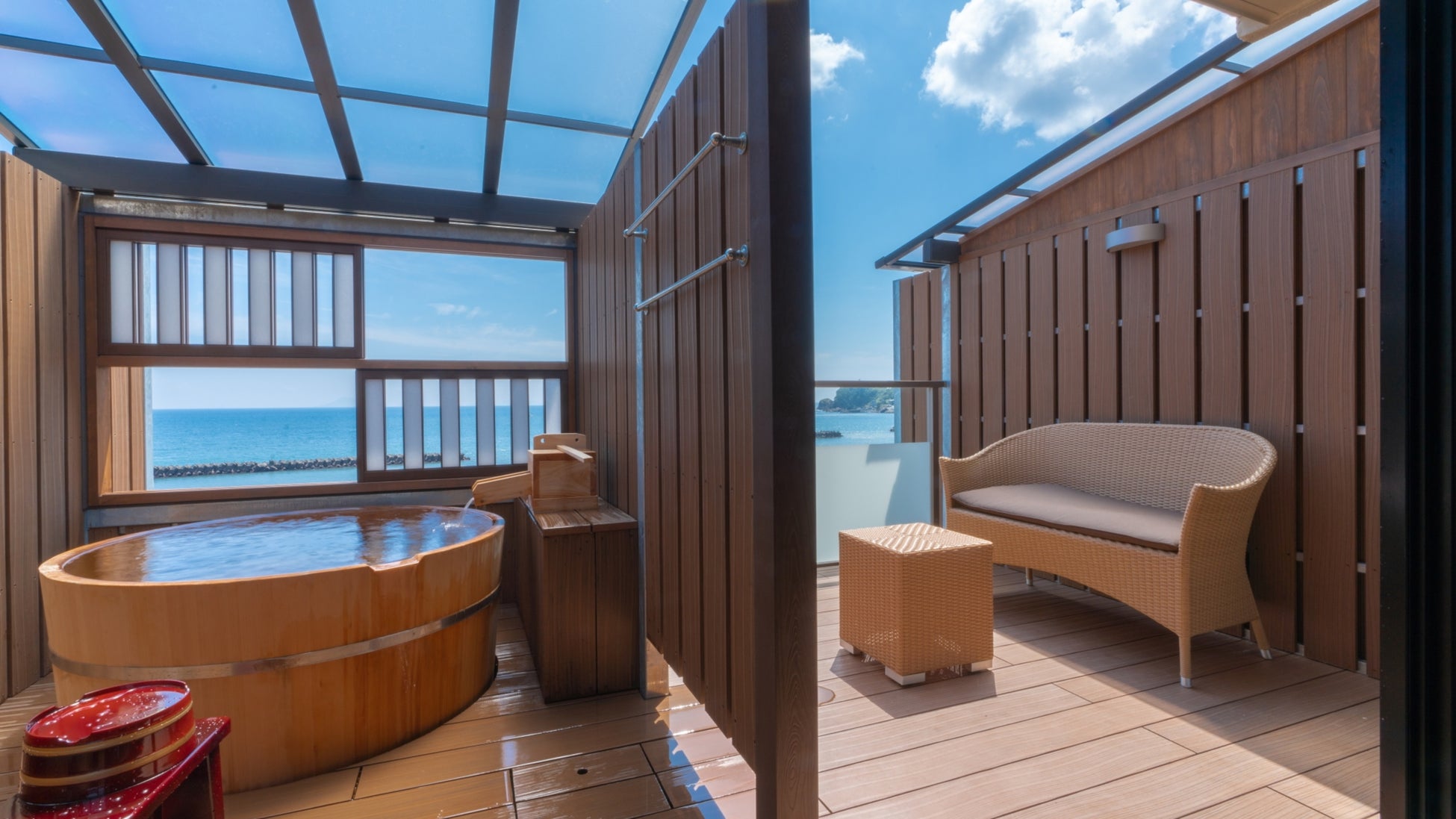 12畳の琉球畳が敷かれた和風ベッドルーム、太平洋を望む露天風呂、テラス、ヘアーアイロンや女優ミラーを完備したパウダールームが備え付いた客室です。和モダン風のデザインの中、木のぬくもりと趣を感じる空間です。