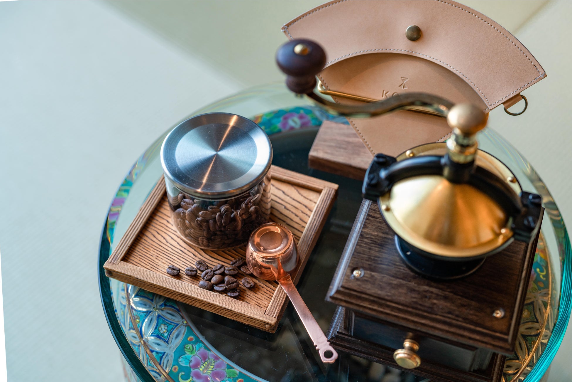 自家焙煎珈琲工房、「カフェアイラナ」の島村氏監修の下、ザッセンハウスのミルなどを完備してございます。そして、コーヒー豆は、豆の目利きからから焙煎まで、各所にこだわりぬいたものを、潮雲オリジナルとしてブレンドしております。それらのコーヒーをミルで挽き、お召し上がりください。