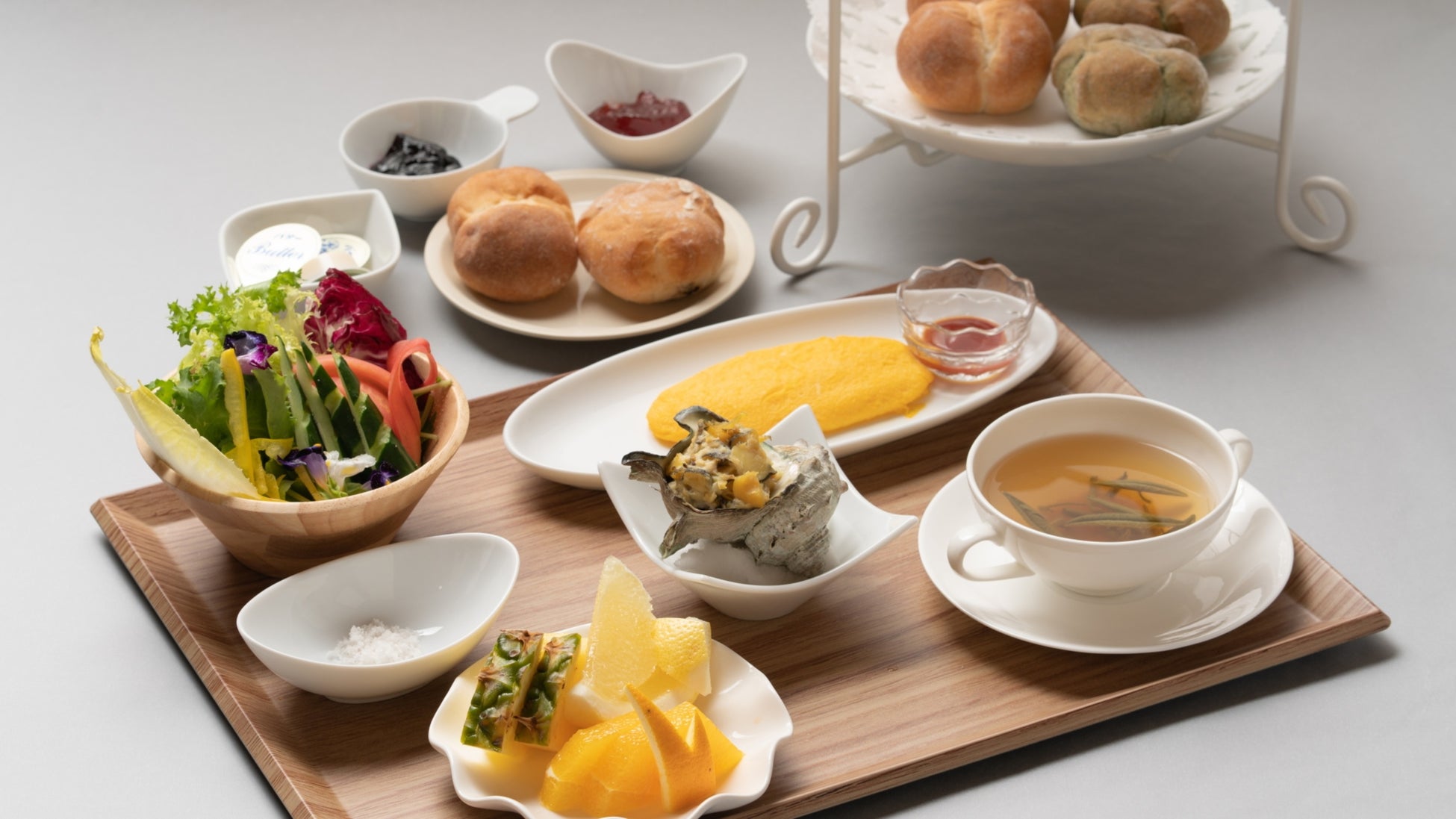 白身魚、ホタテ、ベーコン、3つのグリル料理の中から選べるメインの一皿、伊豆の温野菜、サザエのグラタン等。伊豆の海産物、野菜を使用した、色鮮やかで体に優しい洋食をご用意いたします。パンはもちろん、伊豆の農家が製造しているいちごジャム、ブルーベリージャムなど、細部にまでこだわり抜きました。 朝食のこだわりの一つが、コーヒーと朝食後の余韻。生豆の選定、焙煎までこだわりぬいている河津の自家焙煎工房「カフェ アイラナ」の島村氏。その監修の下、当館の朝食との相性を追求し、ブレンドもお願いしました。食事中だけでなく、食後の余韻もお楽しみくださいませ。