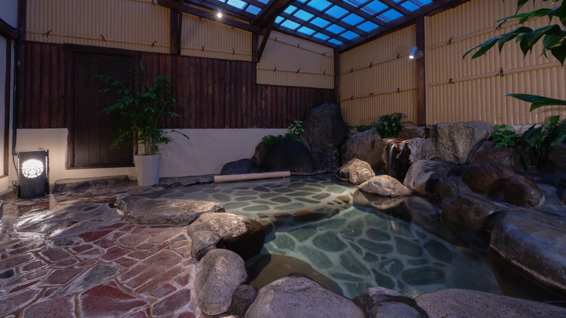 複数の大きな岩で作った湯舟と寝湯、二つのお風呂が愉しめます。時間帯によって、大浴場、貸切風呂としてご利用いただけます。貸切風呂をご利用の場合は、チェックイン後に承ります。