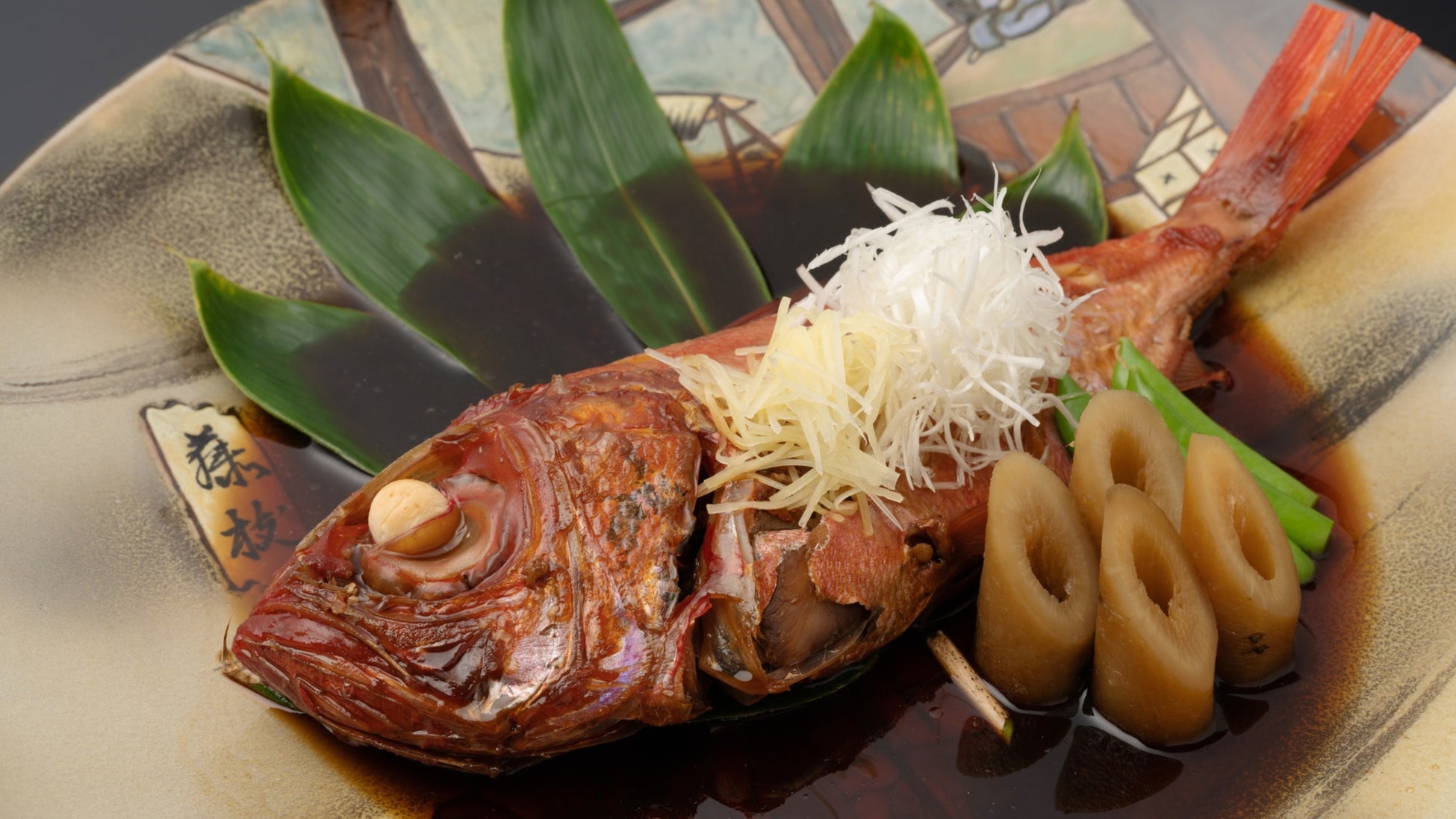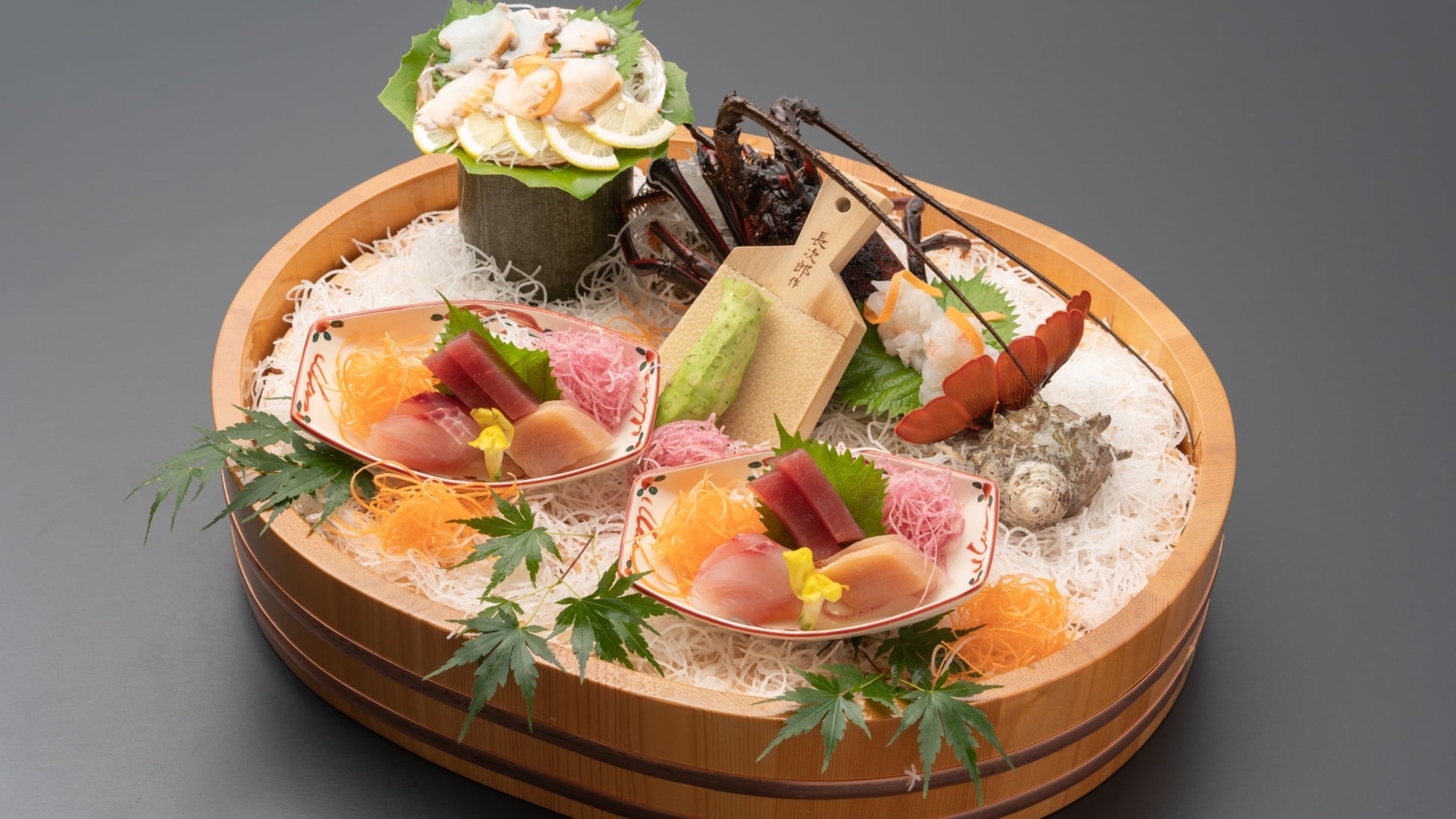 献立は、伊勢海老や鮑などの新鮮な海の幸、金目鯛の煮つけ(一尾)、わさびの名産地河津ならではの、わさび丼などの料理で構成しています。これらを当館料理長(安斎博忠)によって、調理いたします。伊豆の旬の食材を使い、味が美味しい、つまりは舌で楽しめるのはもちろんのこと。器や料理提供の演出にもこだわり、目でも楽しめるような献立、料理を目指しております。