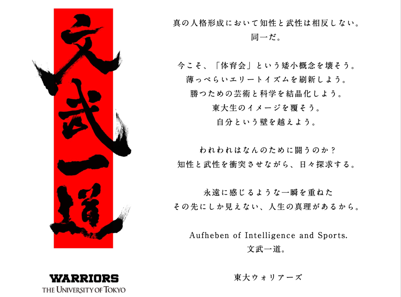 東大がスポーツで日本一になる、そんな誰も想像しない大きな野望をアメフト部が実践し、そのムーブメントを東大全体に波及させていく。さらには東大以外にもスポーツによる取り組みを広げていくことで、日本の将来をリードする人材育成に貢献する。最終的には、日本のスポーツに関する価値観を変え、日本の国家を強靭にしていく、そんな未来を切り拓く。この大きな志を追求しながら残りの試合に臨んでまいります。