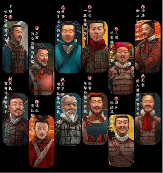 日本で初めて販売される「蒹葭十二士」(けんかじゅうにし)とは、秦の始皇帝陵博物院にて8千体の兵馬俑(死者と一緒に埋葬した、兵士及び馬をかたどったもの)から12体を選出したもので、発掘される前の色などを再現した兵士の総称。この十二兵士は将軍、軍吏、車兵(馬車の騎手)、射手、歩兵、騎兵、老兵及び文官という異なる職位を持つとされています。蒹葭十二士は勇ましい表情を浮かべており、千人千様兵馬俑のミニコレクションとも呼ばれます。生き生きとしたミニコレクションは、蒹葭十二士の日常生活や愛憎・恩讐が表現されています。