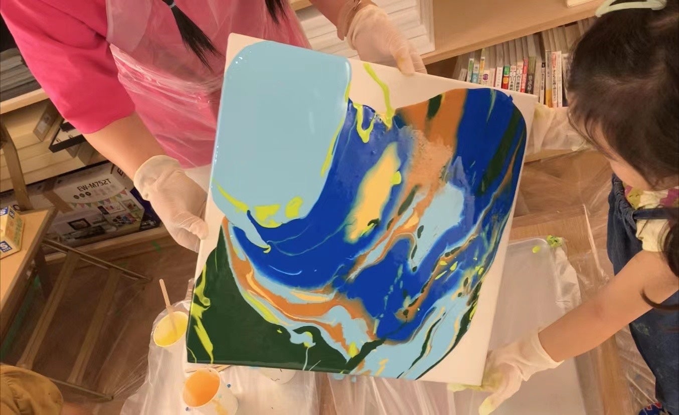 絵の具の流動性を利用したアート作品のことです。どんな仕上がりになるか予想できず、偶然にゆだねるところが魅力です。