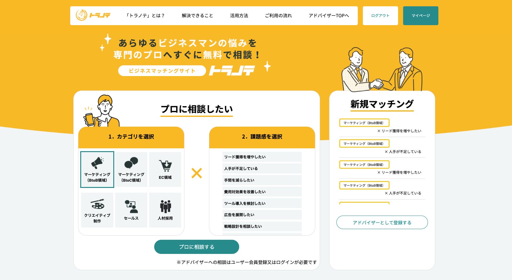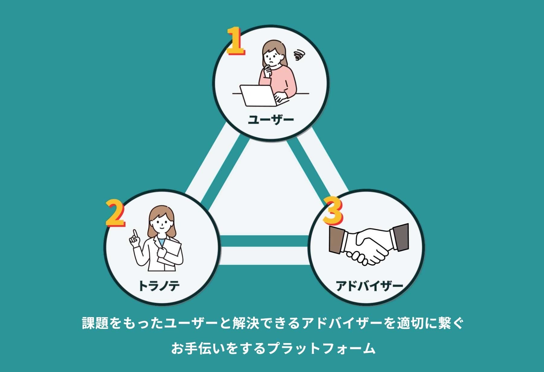 トラノテはビジネス課題の解決に困るユーザーと専門分野で活躍するプロのアドバイザーをマッチングいたします。