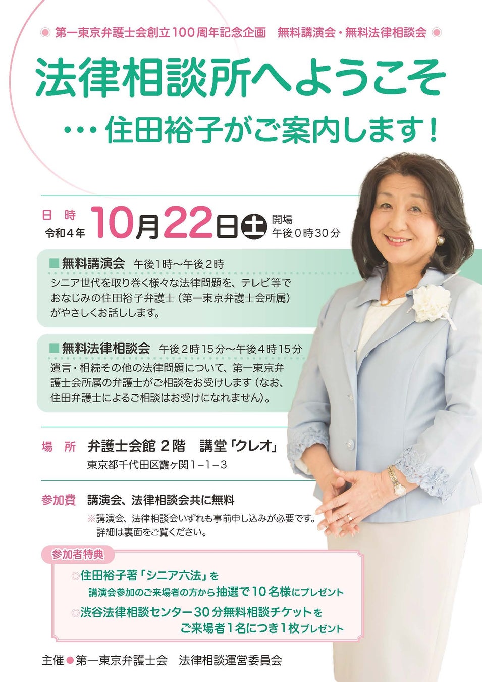 ~テレビ等でおなじみの住田裕子弁護士(第一東京弁護士会所属)による無料講演会と第一東京弁護士会所属弁護士による無料法律相談会~
