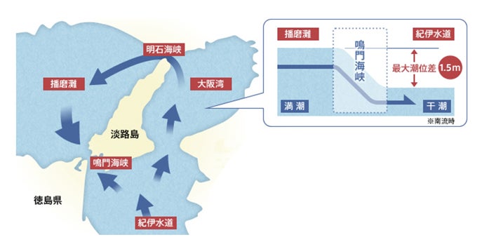 類まれな自然現象の渦潮は、淡路島の北側・大阪湾から播磨灘へ流入する潮流と、南側・紀伊水道から入る潮流が、鳴門海峡で合流する際に生じる潮位差と速度差によって生まれています。