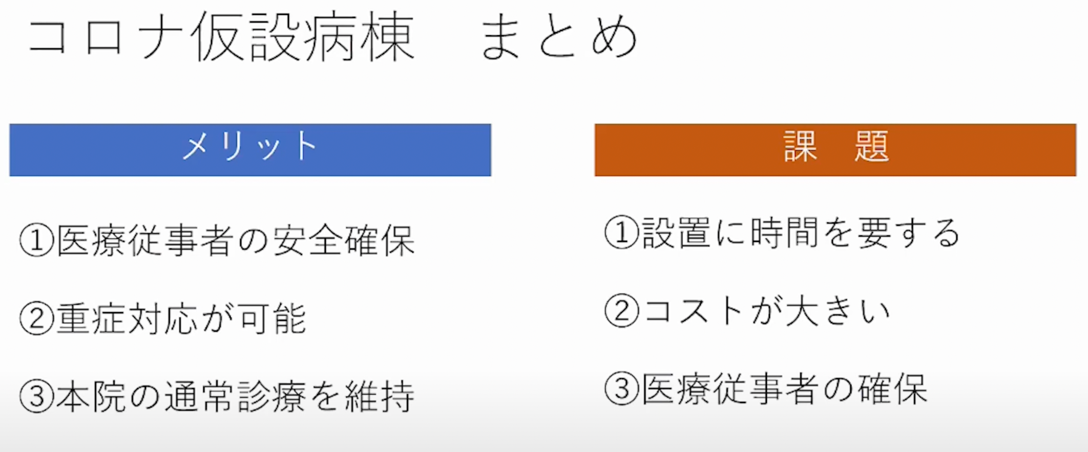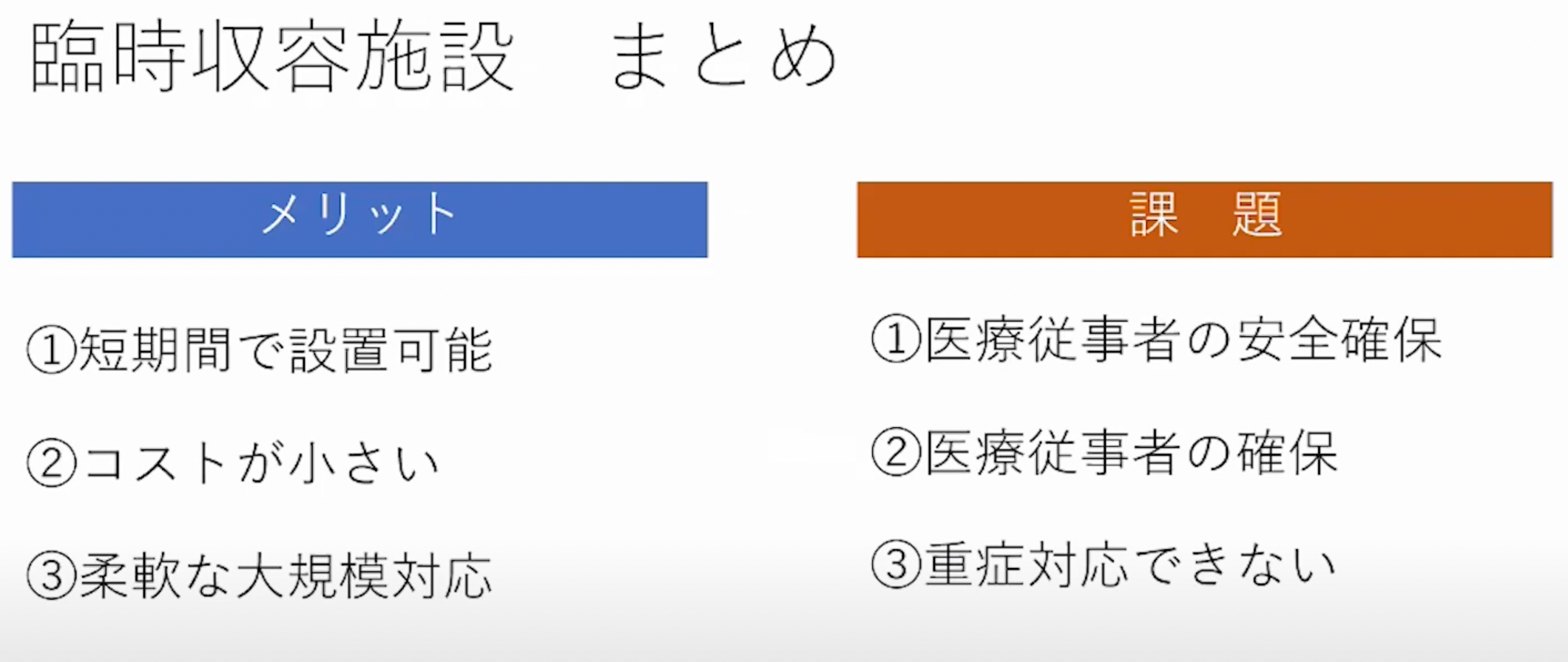 短期的であれば、災害対応として臨時医療施設は有用。しかし、長期的には通常の医療対応体制を整えることがやはり必須。そのために、耐えられる「短期」が半年なのか?1年なのか?など、今回のことを踏まえて、今後さらに議論が必要です。