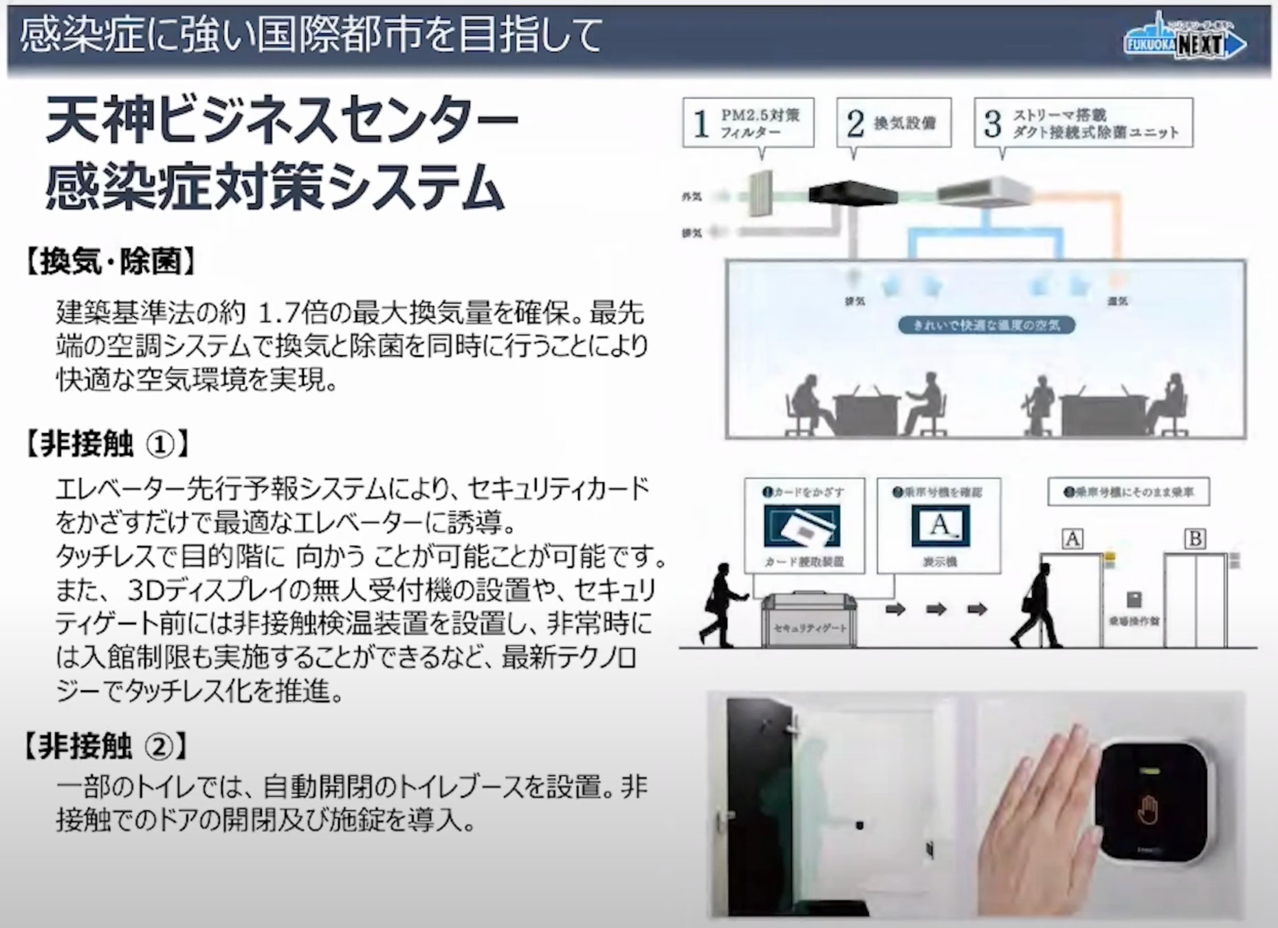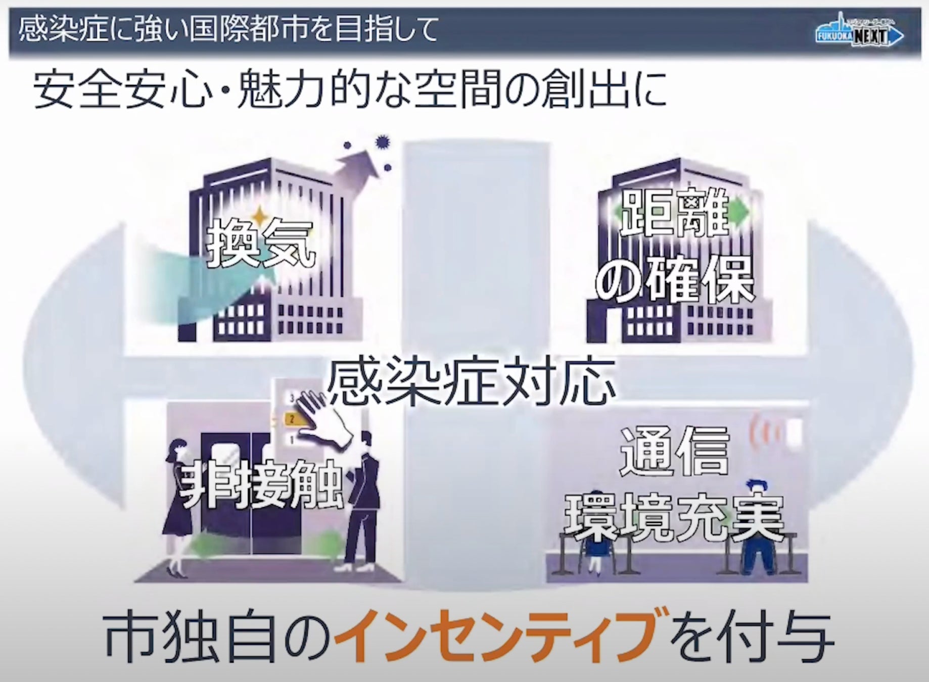 福岡市では、中心部の老朽化が進んだビルの建て替えプロジェクトが複数進んでおり(天神ビッグバン、博多コネクティッド)今後はオフィスの価値が再定義されていきます。コロナ禍でオンラインの普及が進んだ一方、人が集まることの価値も再認識されました。このような観点から、オフィスをより魅力的な環境に整えることが必要であり、感染症対策もその一つです。福岡の特区制度による規制緩和を活用し、基準値以上の換気能力や非接触で操作できるテクノロジーなどを活用した建築計画には容積率を追加するという市独自のインセンティブを付与することで、感染症対策を推進しています。