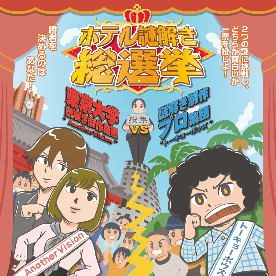 最後に、どちらが面白かったか参加した宿泊者だけがWEB投票できる。たとえ甲乙つけがたくてもどちらかに一票を投じなければならない。謎解きが最後まで完了していない参加者も投票は可能。※投票は開催期間中1名につき1回のみ