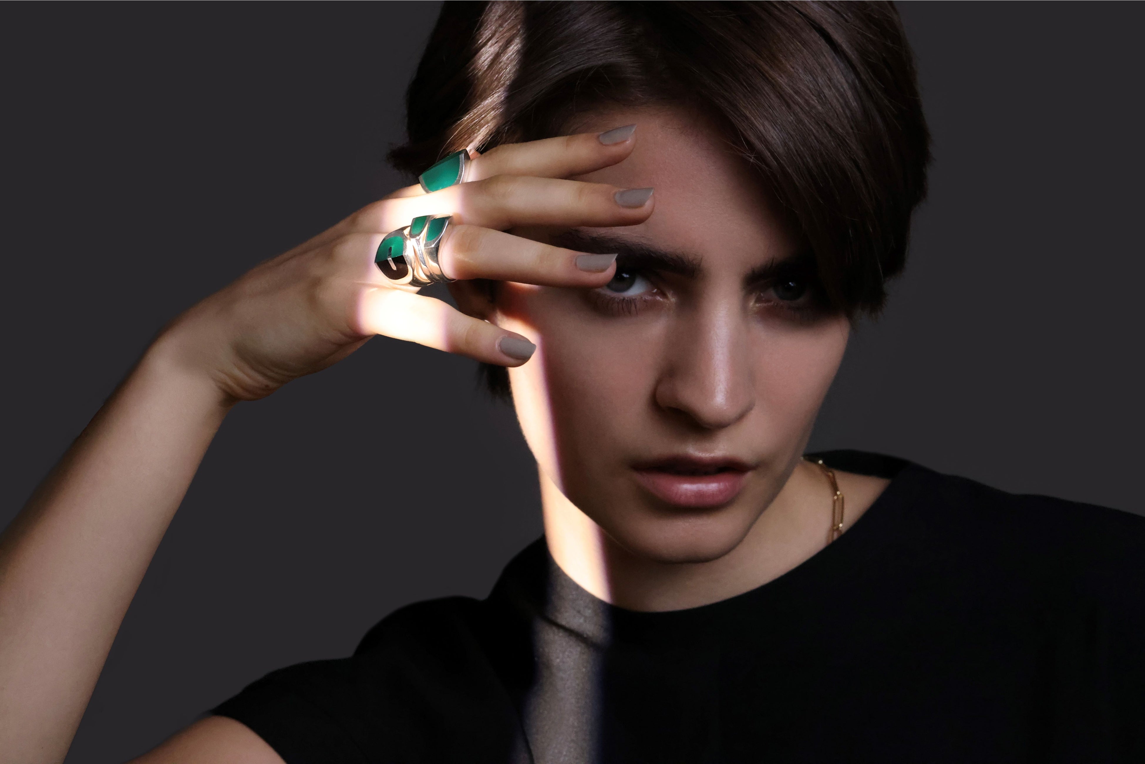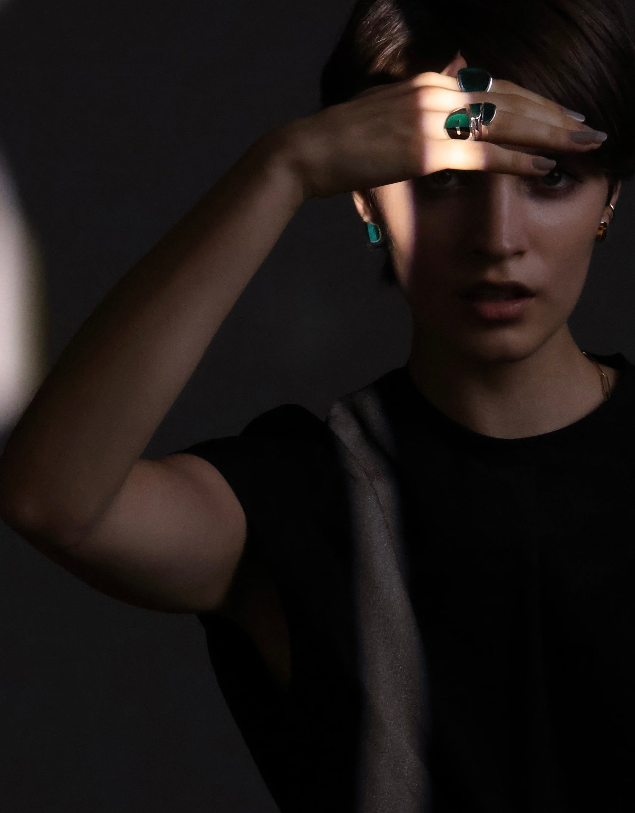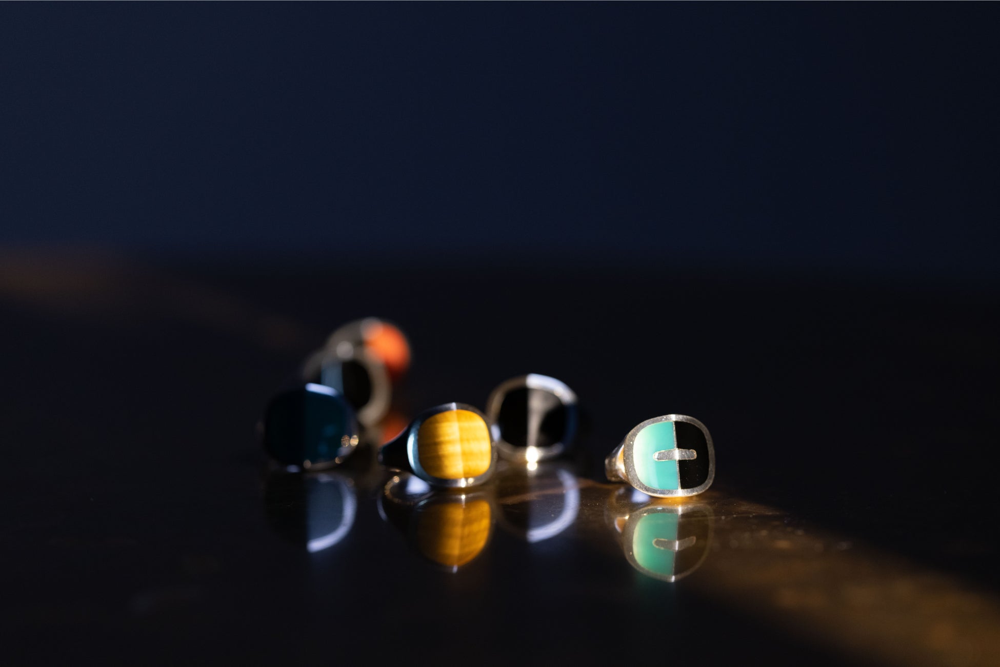 「ピラミッド」シリーズは、ぴったりと嵌め込まれた天然石とシルバーの土台を同時に研磨する特別な技法を採用。微細な砂粒と流水を使い、熟練した職人の手で一つ一つ丁寧に磨き上げています。