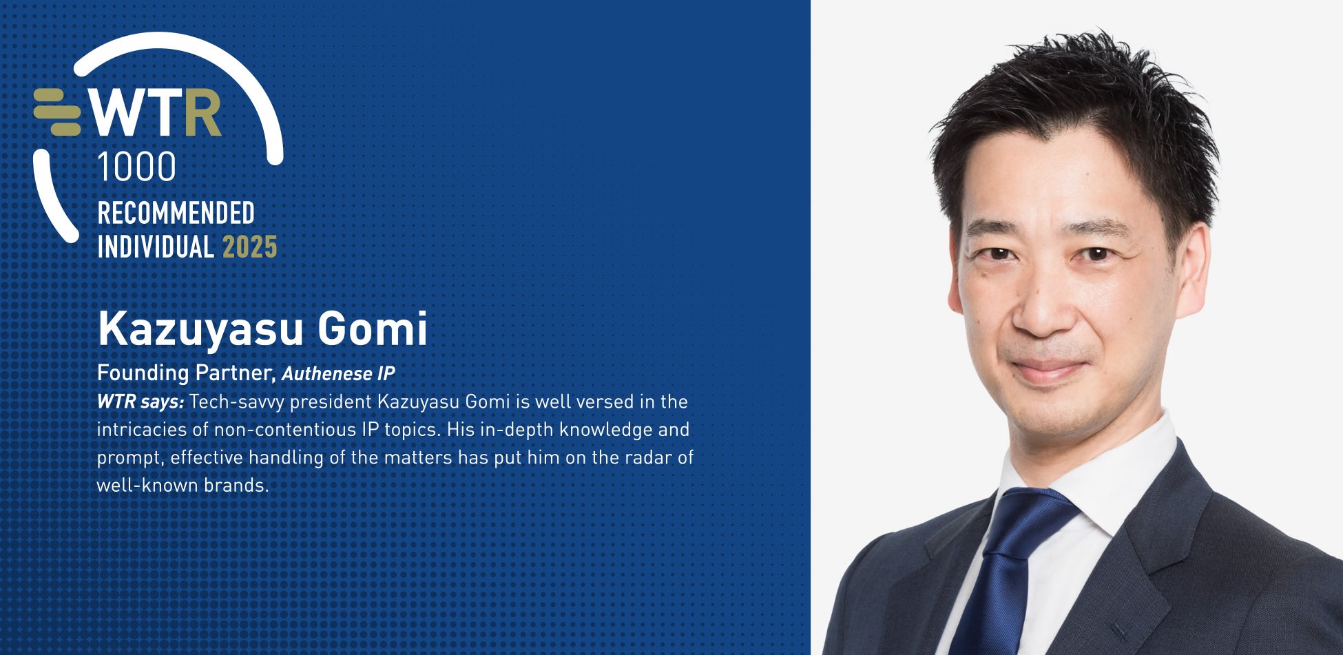 Authense弁理士法人(本社:東京都港区、代表弁理士 五味和泰)は、世界で最も有能な事務所と実務家のランキングである2025年「World Trademark Review 1000」の事務所部門と個人部門(代表弁理士 五味和泰)にそれぞれ選出されました。2024年に続き2年連続の選出となります。